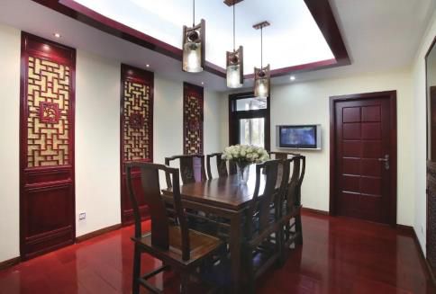 ▲棕赤色的實木門與空間的中式樣式完善匹配,統一了空間的總體色彩。