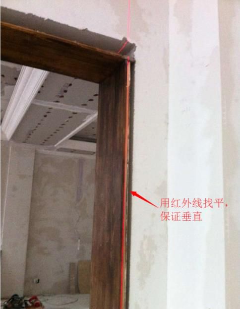 都做好后,就能夠將門套往門洞里裝載了。先用紅內線儀找平和垂直,確保門套裝載的橫平豎直。還要找好門套與門洞前后左右的距離。