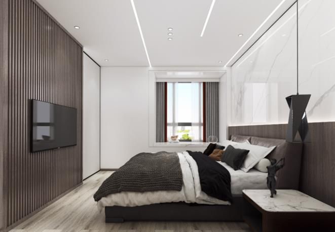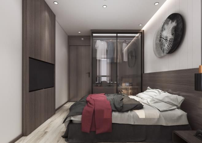 次臥搭配金屬吊燈,玻璃推拉衣柜,電視則是嵌在木飾背景上,加上吊頂?shù)狞c光源,將次臥的空間氛圍烘托的更加溫馨愜意。